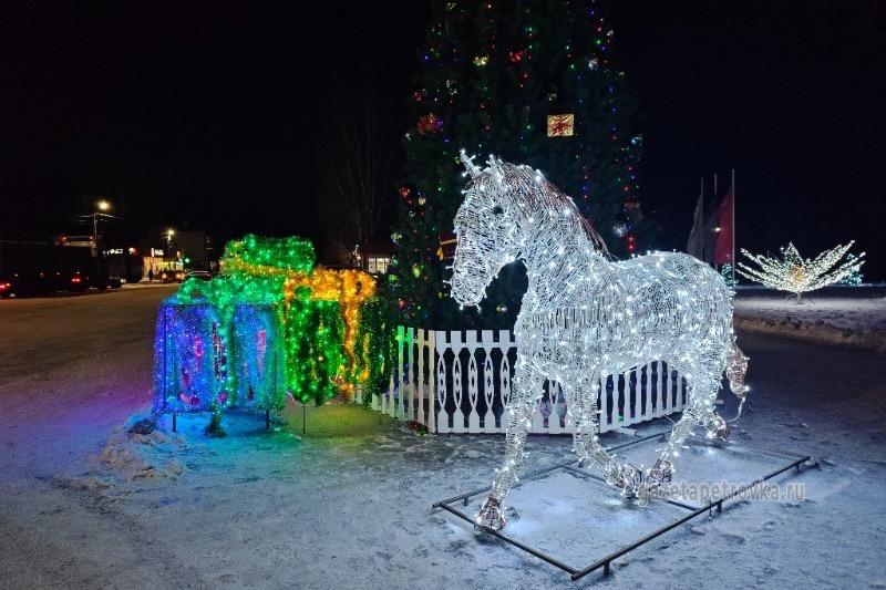 Фигуру лошади из металлической проволоки и гирлянд изготовили Сергей Блудов и Михаил Егоров за три недели. Водители школьных автобусов помогали мастерить фигуры по готовым чертежам в свободное время. Инсталляцию установили рядом с главной ёлкой муниципалитета.