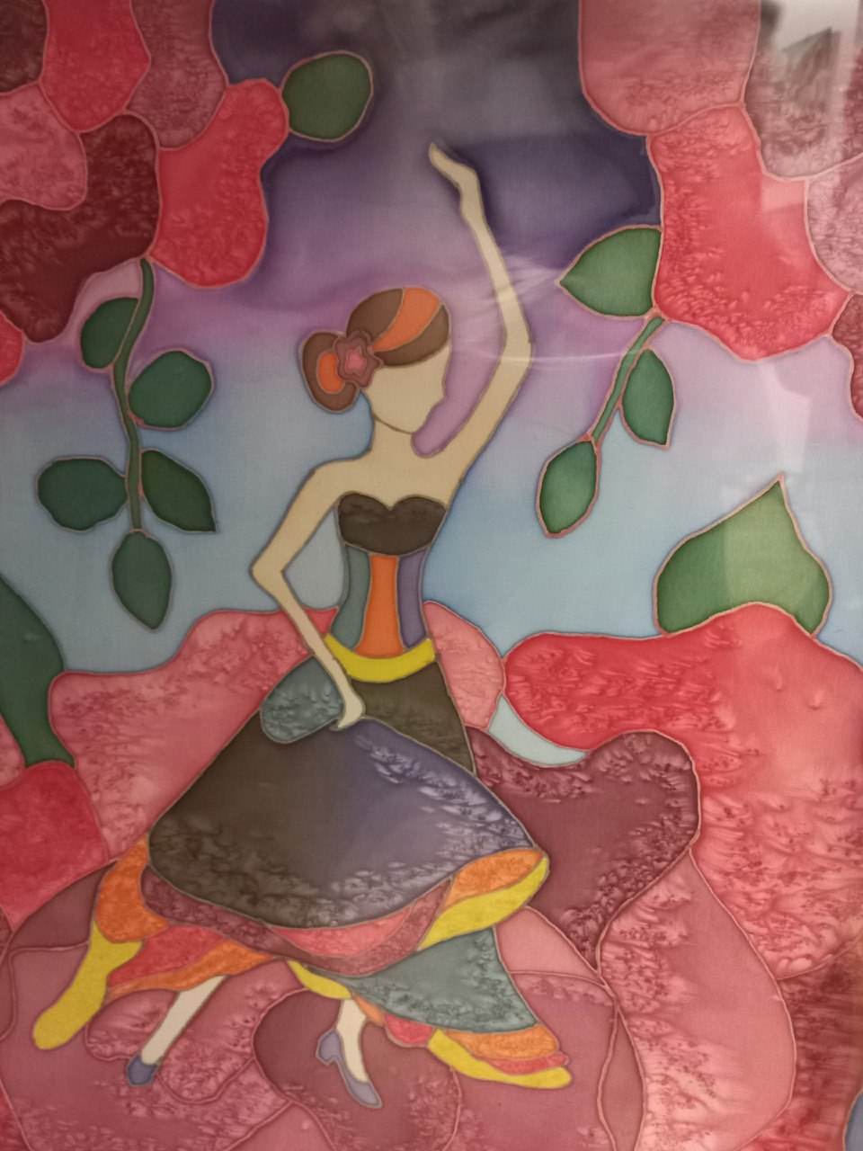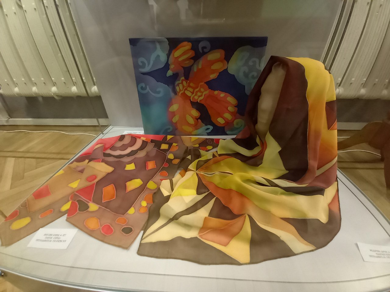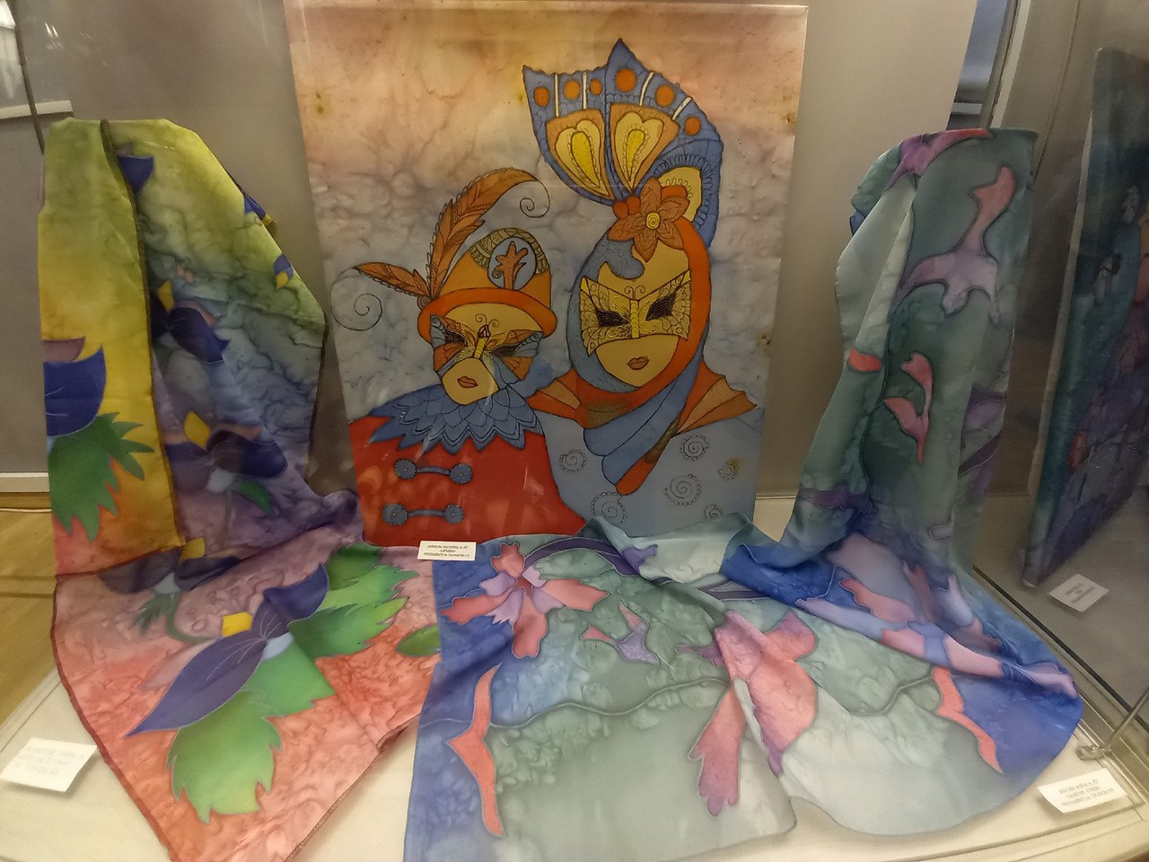 Традиционно экспозиция посвящена Новому году и Рождеству. В этот раз представлены художественные работы в стиле батик – искусства ручной росписи по ткани. Зрители увидят декоративные панно, платки, шарфы, палантины, выполненные в техниках горячего и холодного батика. Каждый узор и композиция создаются вручную, поэтому они всегда оригинальны и неповторимы.