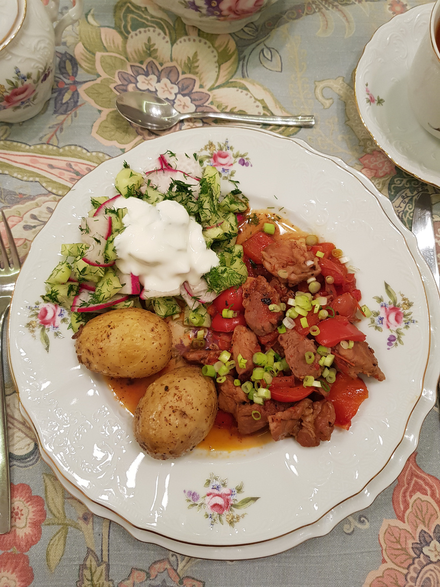 Перед подачей на стол выложить на тарелку запечённый картофель, тушёную свинину и свежий салат. По желанию, посыпать мясо нарезанным зелёным луком. Такой ужин станет не только сытным, но и по-настоящему домашним и уютным, наполняя атмосферу теплом и радостью семейного общения.