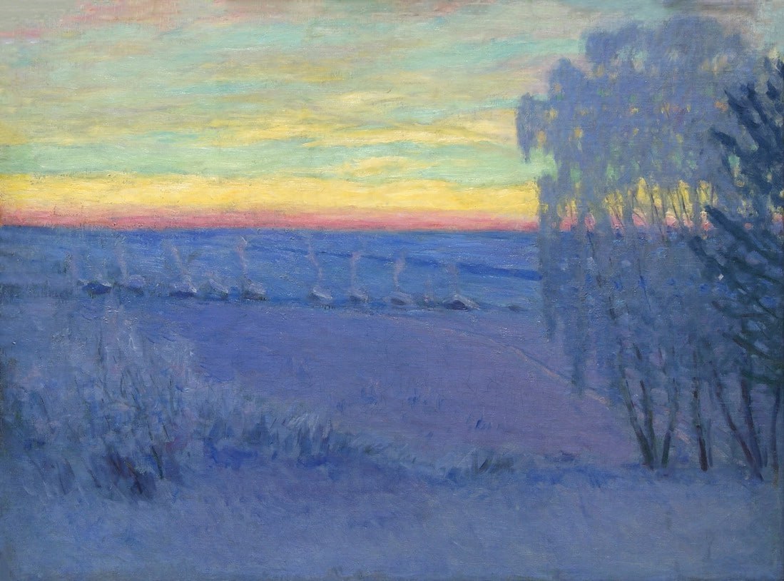 Зимняя сказка в одном застывшем мгновении. Солнце восходит, оставляя за собой тропинку света на холодном горизонте. Несколько иссиня-ледяных деревьев будто хранители спокойствия застыли справа, оберегая тайну зимнего сна природы.