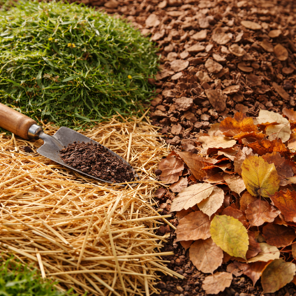 - Листья: идеальны для использования осенью и зимой. Они бесплатны, улучшают структуру почвы и защищают от промерзания, но могут слёживаться и не все сорта полезны.