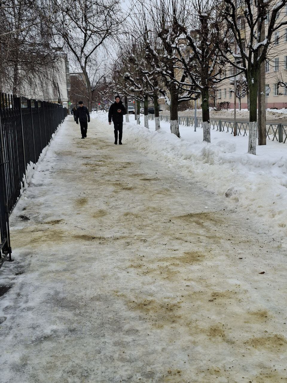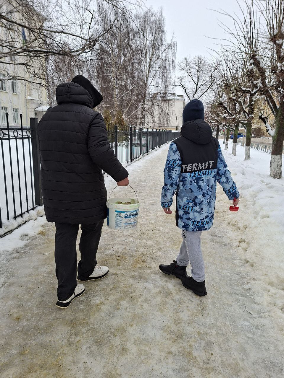 Ученики лицея №22 посыпали песком тротуар на улице Полковой, сделав путь горожан безопаснее.