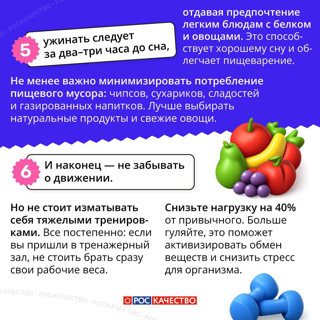 Следуя рекомендациям фитнес-тренера, нутрициолога Международного института интегративной нутрициологии Екатерины Рахматуллиной, можно легко и без лишних стрессов вернуться к привычному режиму питания и чувствовать себя хорошо.