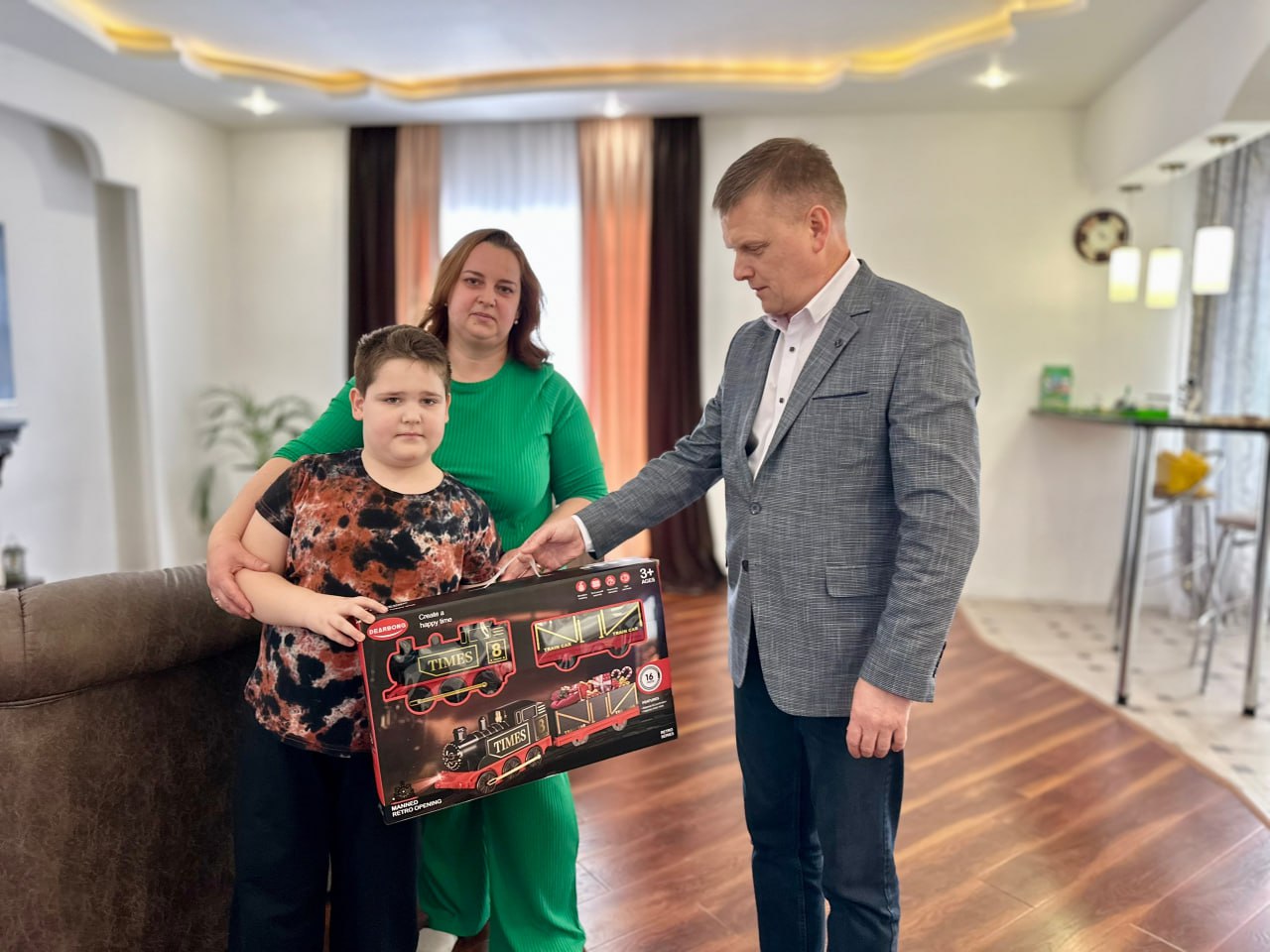 Егор получил в подарок детскую железную дорогу, а Андрей - развивающий конструктор. Младшему брату Андрея Никите Роман Рыжков тоже подарил конструктор.