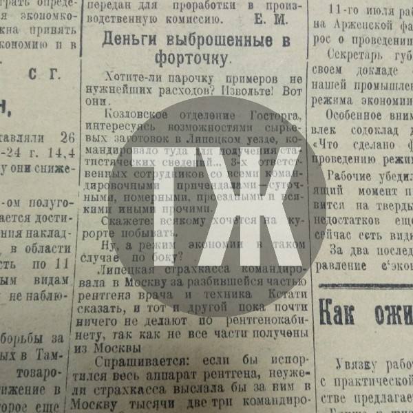 В Козловском отделении Госторга нерационально используют средства. Примеров много, однако один случай оказался вопиющим. В Липецкий уезд для получения статистических сведений направили трех ответственных сотрудников. Находясь там, они забыли о режиме экономии и пользовались всеми благами. Аналогичная ситуация — в Липецкой страхкассе, где за очередными деталями к рентгеновскому аппарату в Москву отправили несколько врачей. Медработники мало того, что жили в столице на широкую ногу, так еще и привезли не все, что требовалось.