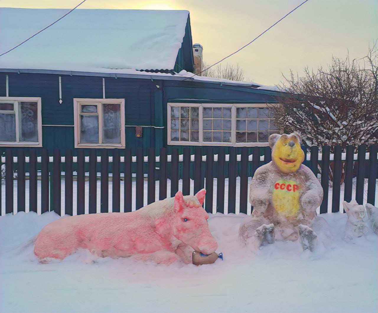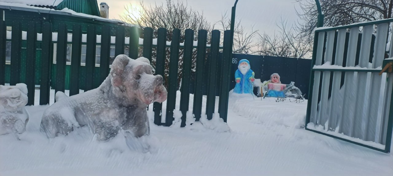 Сергей около забора своего частного дома смастерил скульптуры Деда Мороза, Емели на печке, медведей, волка и других животных. Как рассказал автор скульптур, снежные фигуры ломали, но Сергей всегда подправлял и восстанавливал их.