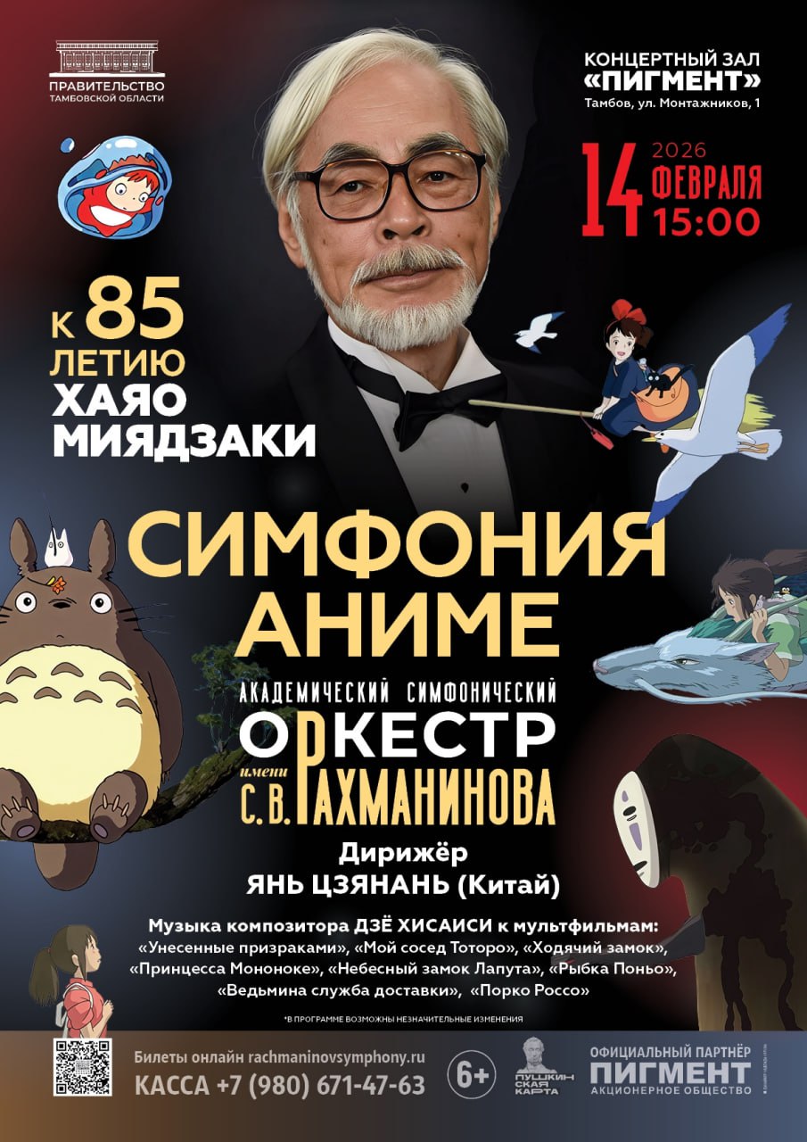В Тамбове состоится концертная программа «Симфония аниме», приуроченная к 85-летию легендарного режиссёра Хаяо Миядзаки. Мастер анимации, чьи работы известны во всём мире, создаёт свои шедевры уже более шести десятилетий и является обладателем престижных наград, включая несколько статуэток «Оскар».