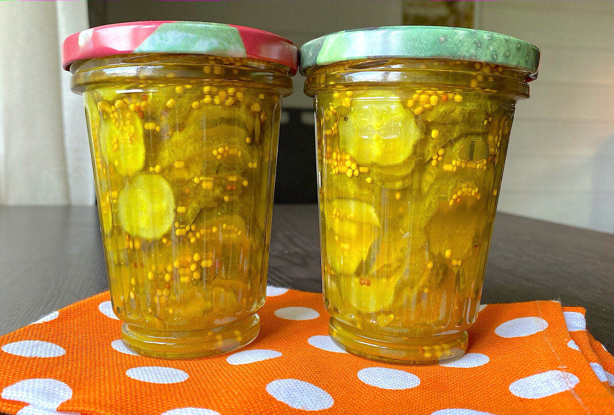 - За это время в сотейник вливается яблочный уксус, добавляются зернистая горчица, сахар и куркума. Эта смесь доводится до полного растворения сахара. Затем добавляются огурцы, которые варятся на медленном огне около пяти минут до изменения цвета и нежности.