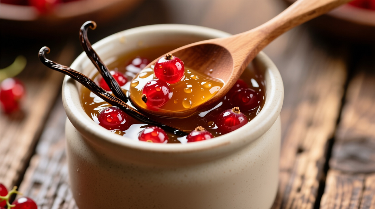 Красная смородина — это яркая и запоминающаяся ягода, известная своей яркой кислотностью. Однако при добавлении ванили её вкус обретает новые грани; сладковатые ноты ванили смягчают натиск кислоты, создавая совершенную гармонию. Такой джем легко станет фокусом любого стола благодаря своей великолепной текстуре и аромату, который словно окутывает.