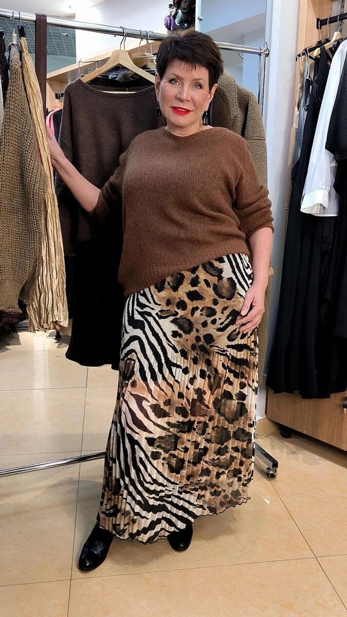 - Женственный и изысканный: длинная плиссированная юбка с принтом «под леопарда» прекрасно сочетается с шоколадным свитером с круглым вырезом. Завершите образ удобной обувью и неброскими украшениями.