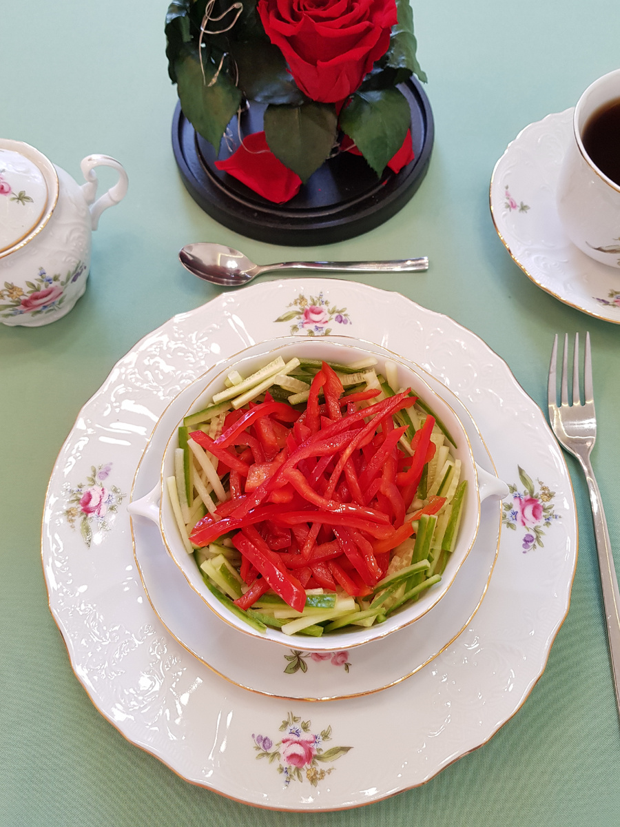 - Соберите салат: разложите нарезанный огурец по салатникам, сверху выложите нарезанный перец.