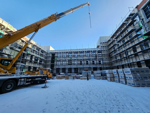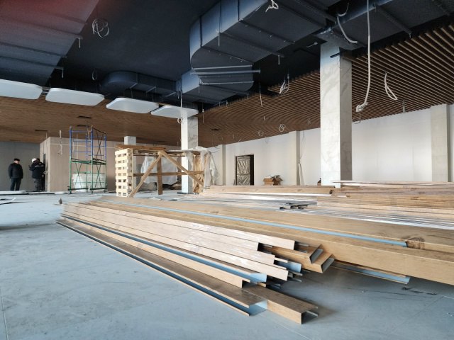Также сообщается, что специалисты проводят облицовку фасада здания металлокассетами. Полным ходом идет поставка необходимого технологического оборудования и мебели. Строительная готовность объекта составляет 65%.