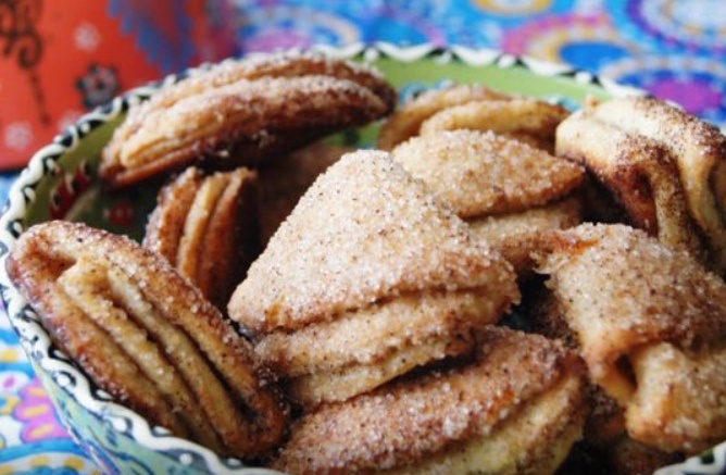 Растопленное масло соединяют с основными ингредиентами, затем постепенно вводят муку с разрыхлителем. Тесто вымешивают и раскатывают, затем выбирают форму печенья — кружочки, которые можно легко превратить в четвертинки благодаря посыпке.
