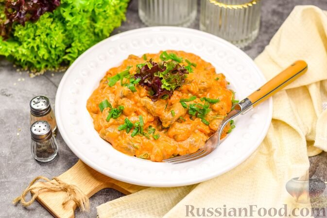 - Ингредиенты: сердечки куриные, лук, морковь, сливки, томатная паста, специи.