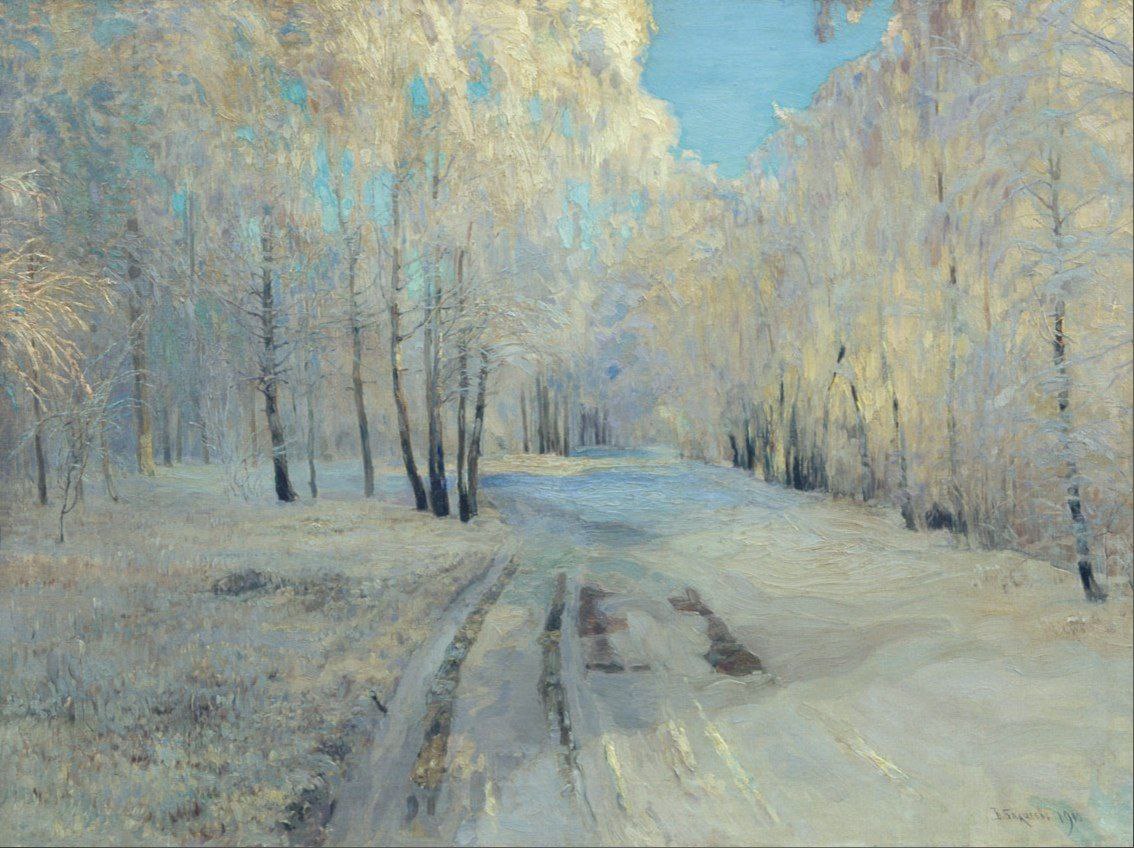 На полотне изображён зимний лес с просекой и деревьями, покрытыми инеем, а также дорога с отпечатками полозьев. Среди глубоких снежных сугробов видна дорога, сворачивающая справа налево, на которой заметны следы полозьев. На поверхности снега различимы тени деревьев и полосы света, подчёркивающие работу со светотенью. Над просекой изображено ярко голубое холодное небо.
