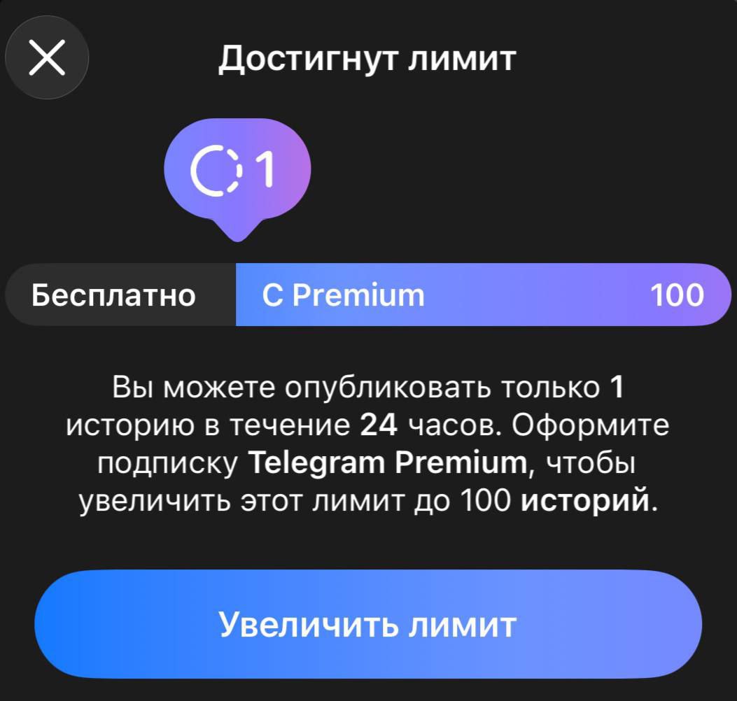 Для бесплатных аккаунтов действует лимит — не больше одной сторис в сутки, тогда как владельцы Premium могут публиковать до 100 в день.Обновление в Telegram прошло вчера.Подписаться...