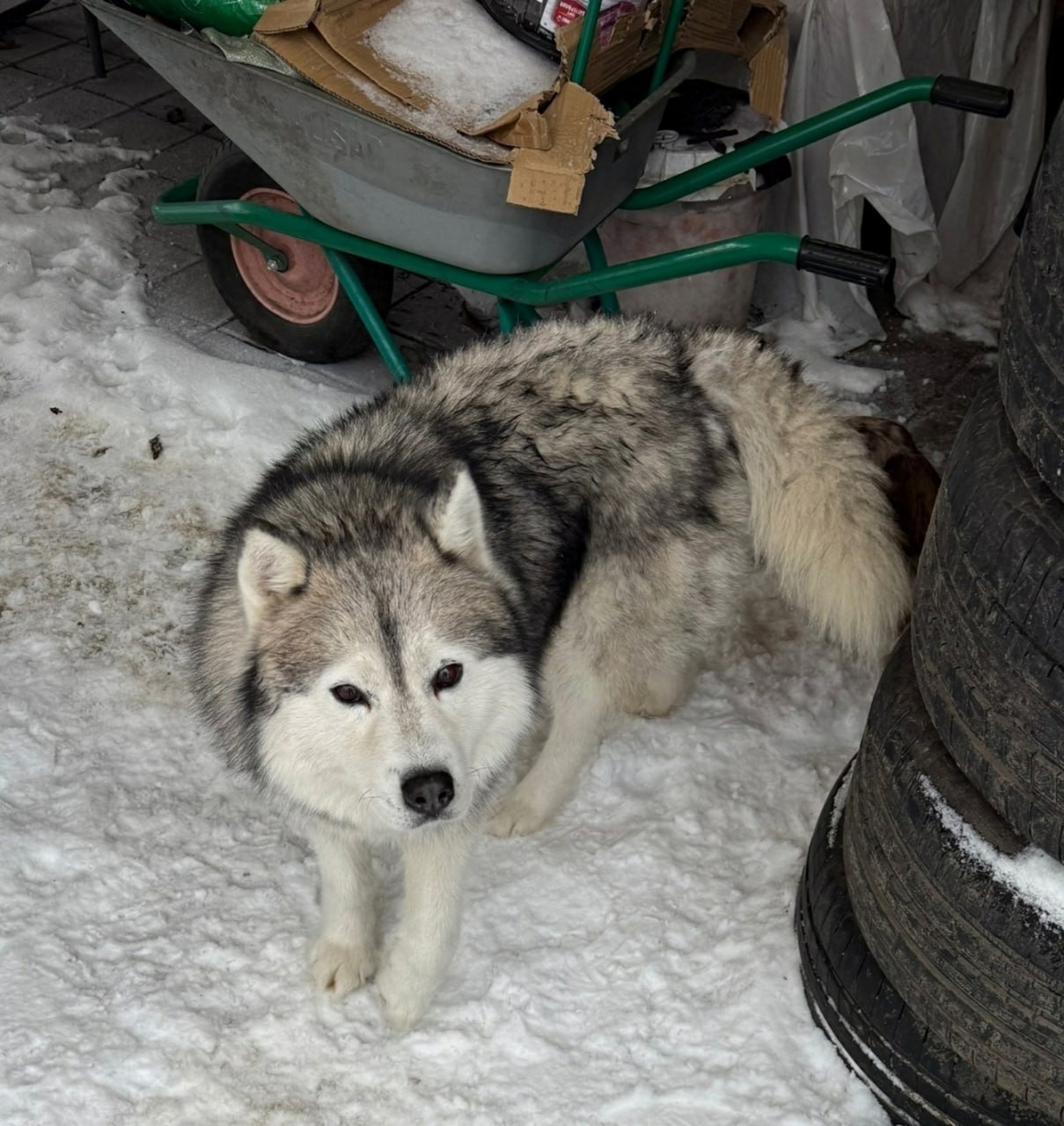 Это мальчик, порода - хаски или маламут. Собака бегала на севере Тамбова. Сейчас временно находится на передержке.