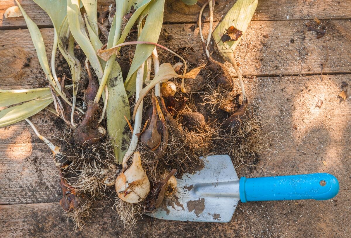 - Сначала нужно извлечь луковицы вместе с «детками», при необходимости удалить листья и цветоносы;