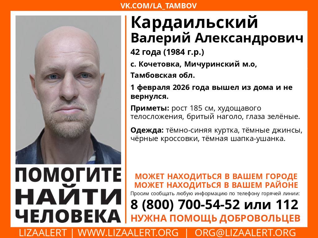 #Кардаильский Валерий Александрович, 42 года, с. #Кочетовка , #Мичуринск 'ий м.о., #Тамбов 'ская область. 1 февраля 2026 года вышел из дома и не вернулся. Максимальный репост! __________________________ Инфорги поиска: Мария (Леваш) и КСЮша Позвонить инфоргу: КСЮша