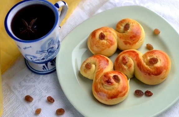 Нарезав тесто на 16 равных частей, каждую часть раскатываем в жгутик и сворачиваем в характерную «петлю». Далее булочки выкладываются на противень и оставляются на расстойку. Перед запеканием их смазывают яичным желтком с молоком и украшают изюмом. Пекутся луссекатт при температуре 180-200 градусов до золотистой корочки — всего 6-8 минут.