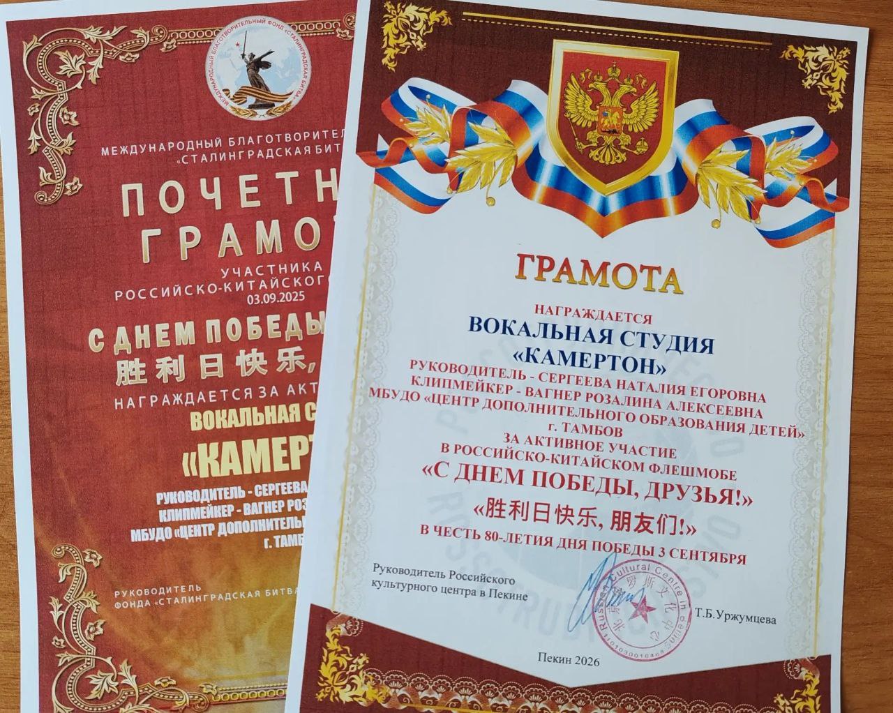 Вокальная студия «Камертон» под руководством педагога Наталии Сергеевой накануне принимала заслуженные поздравления. В Центре дополнительного образования детей чествовали победителей перекрестного российско-китайского флешмоба «С Днем Победы, друзья!».