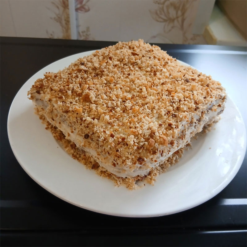 - Разрезать корж на 4 части и собирать торт, чередуя слои: корж, крем, корж и так далее. Обсыпать крошкой верхушку и боковые стороны.
