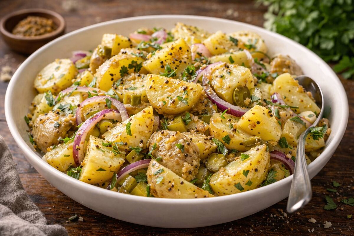 Именно поэтому в этом рецепте крайне важно не оставлять картофель остывать полностью. Горчичная заправка окружает ломтики, подчеркивает их вкус и создает гармоничное блюдо, а не просто набор продуктов. Это объясняет популярность салата в Европе, где его готовят как самостоятельное блюдо.