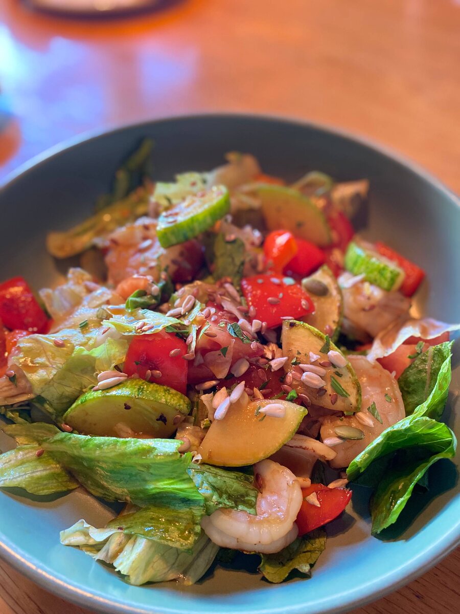 Гордость ресторана — шеф-салат с морепродуктами и овощами на гриле. Здесь нежные креветки и кальмары гармонично сочетаются с ароматом гриль-овощей, придавая блюду непревзойденный вкус: