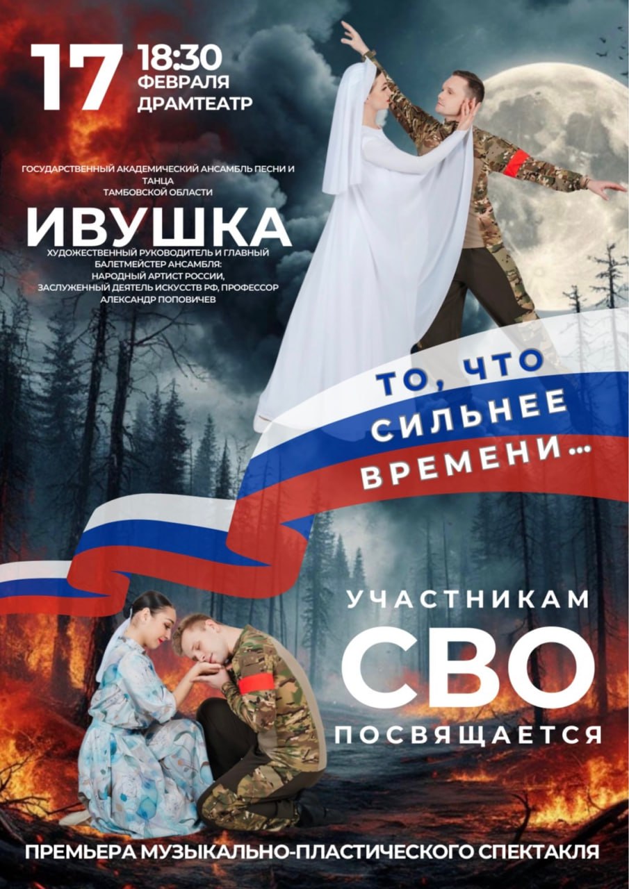 Программа состоит из двух отделений. Первое - премьера музыкально-пластического спектакля «Участникам СВО посвящается». Второе отделение - поздравление ко Дню защитника Отечества. Начало в 17.30.