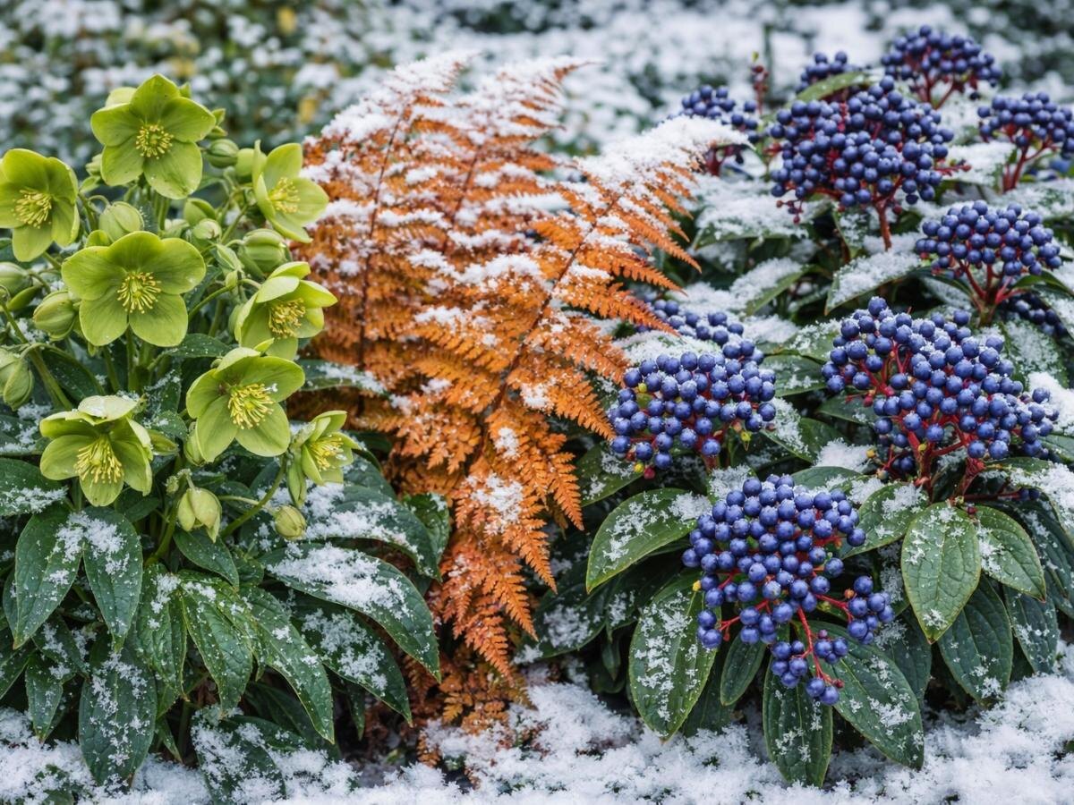 Зелёный цвет зимой воспринимается по-иному — он не соперничает с белизной снега, а, наоборот, подчеркивает его чистоту. Чемерицы с зелёными цветками и самшиты с насыщенной листвой создают четкие формы клумб и бордюров. Эти растения сохраняют свою декоративность и помогают саду выглядеть ухоженным, даже если уход минимален.