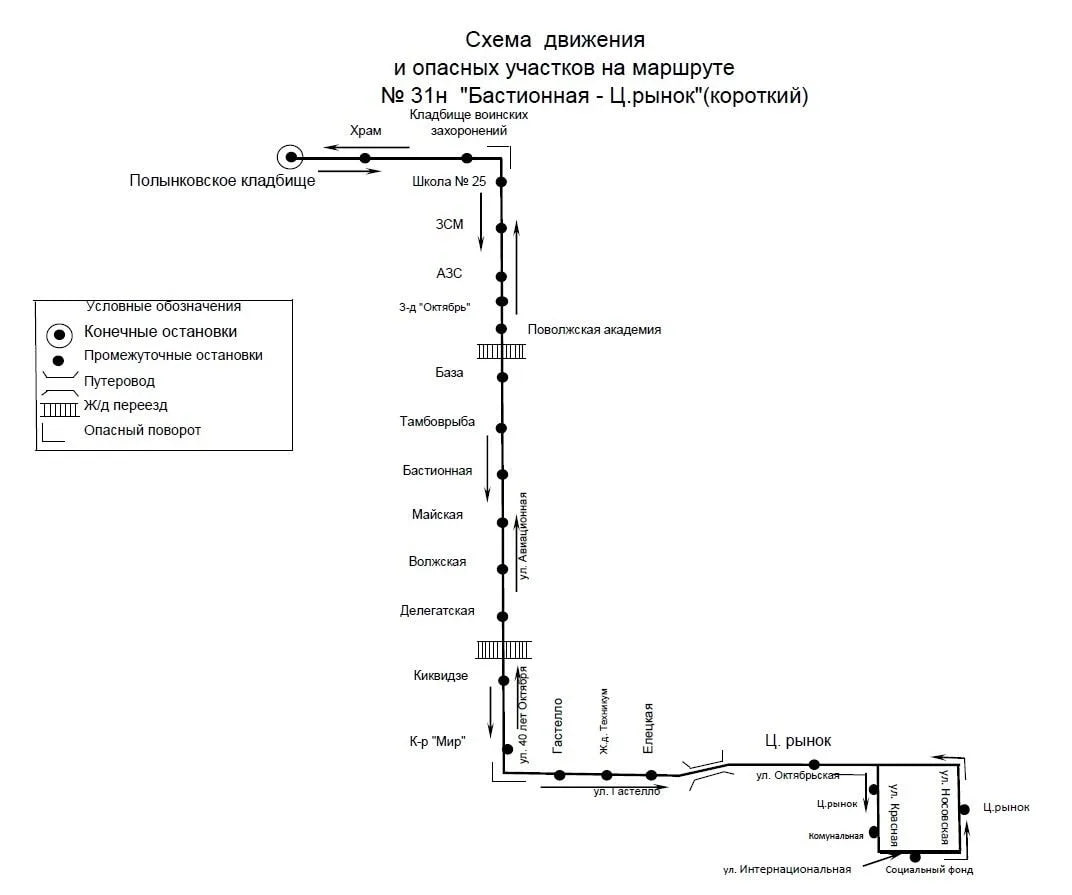 Он ходит с 18 февраля по будням утром и вечером в часы пик. Его маршрут проходит от Центрального рынка до Полынковского кладбища по улицам Красная, Интернациональная, Носовская, Октябрьская, Гастелло, 40 лет Октября, Авиационная, Бастионная и обратно.