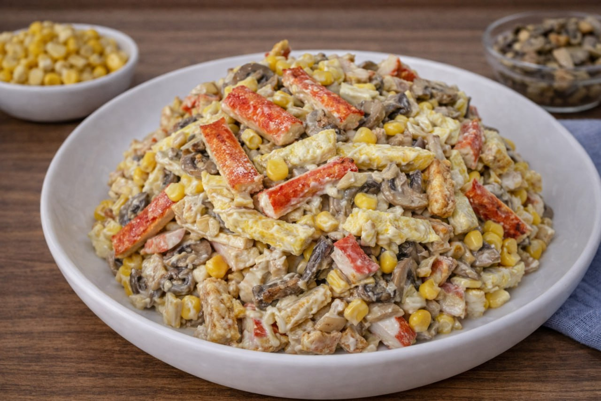 6. В большой миске соедините крабовые палочки, омлет и грибы с луком, добавьте кукурузу и заправьте майонезом. Перемешайте и проверьте на соль.