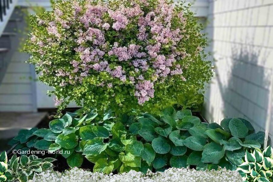 - Хосты предпочитают полутенистые места, так что пространство под сиренью им отлично подойдет.