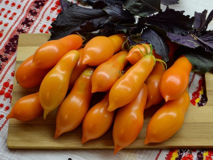 Самое заметное в этом сорте — это его плоды. Ярко-оранжевые томаты имеют узкую шейку и острый носик, что делает их идеальными для сушки и консервирования. Они весят 50-80 граммов и имеют плотную мякоть, которая не растрескивается, что крайне важно при кулинарных обработках.