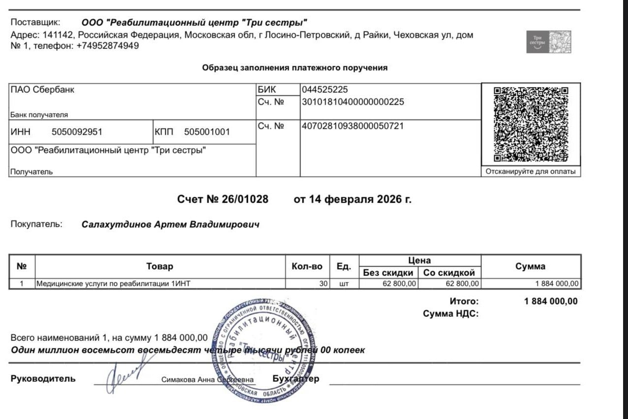 - Артёму требуется дорогостоящая реабилитация. Нас берут в реабилитационный центр «Три сестры». Сутки пребывания там стоят 62 800 рублей. Сумма составляет почти 1,9 млн рублей за 30 дней. Одного курса реабилитации недостаточно. По рекомендациям специалистов, реабилитация необходима в течение года, — сказала сестра Артёма Мария Салахутдинова.
