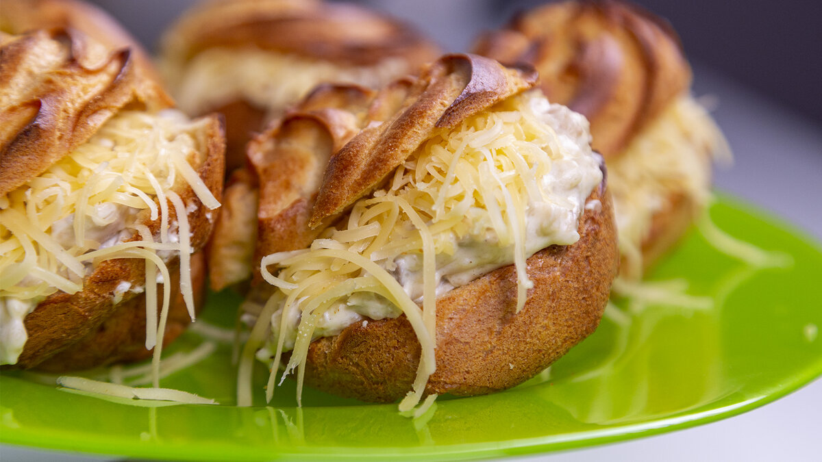 После пяти минут готовки добавьте соль и тщательно взбейте соус венчиком. Достайте профитроли из духовки, немного разрежьте их и аккуратно начините грибным соусом. Сверху посыпьте тертым сыром и накройте вторыми половинками булочек. Подавайте закуску на стол — ваши гости будут в восторге от прекрасного лакомства!