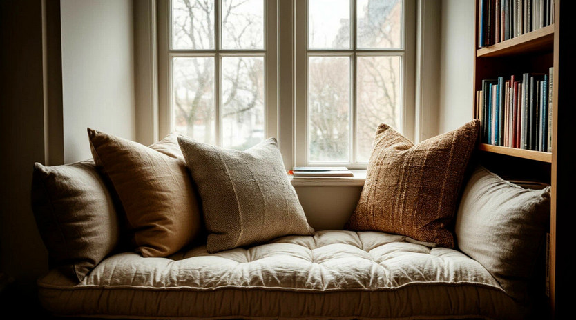 Первый шаг к созданию уютного пространства — это переосмысление текущей планировки квартиры. Возможно, вы не заметили, что подоконник может стать прекрасным местом для чтения. Украсив его мягким матрасом и подушками, вы получите уединенный уголок.