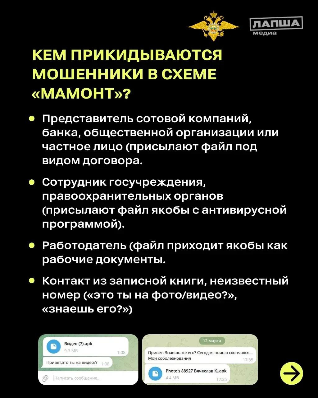 Подробнее о том, как не стать жертвой «Мамонта», смотрите в карточках канала Киберполиция России.