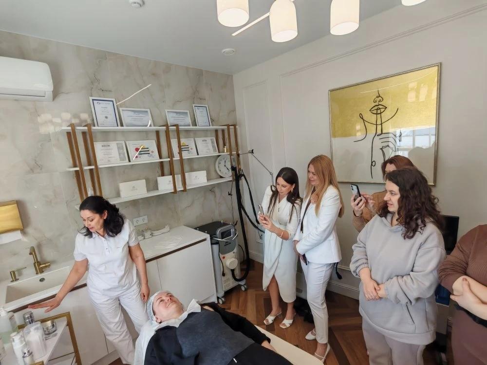 Следующей точкой маршрута стало посещение клиники эстетической косметологии в здании 1911 года. Гостям рассказали о современных методах ухода за собой и показали, как историческая архитектура может органично сочетаться с новейшими тенденциями в индустрии красоты.