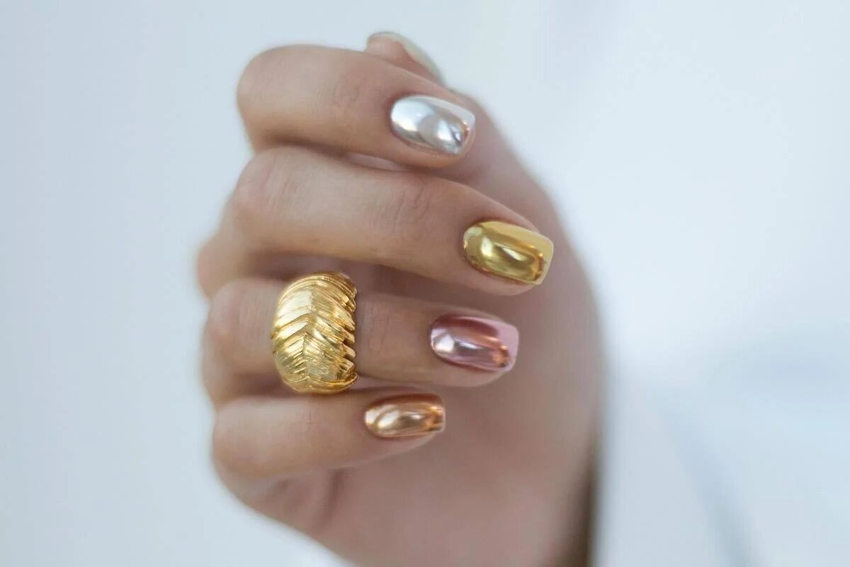 Основная черта этого маникюра – зеркальная поверхность, играющая цветами при любом освещении. Эффект достигается использованием особой фольги, голографической пленки или лака с блестящими частицами.
