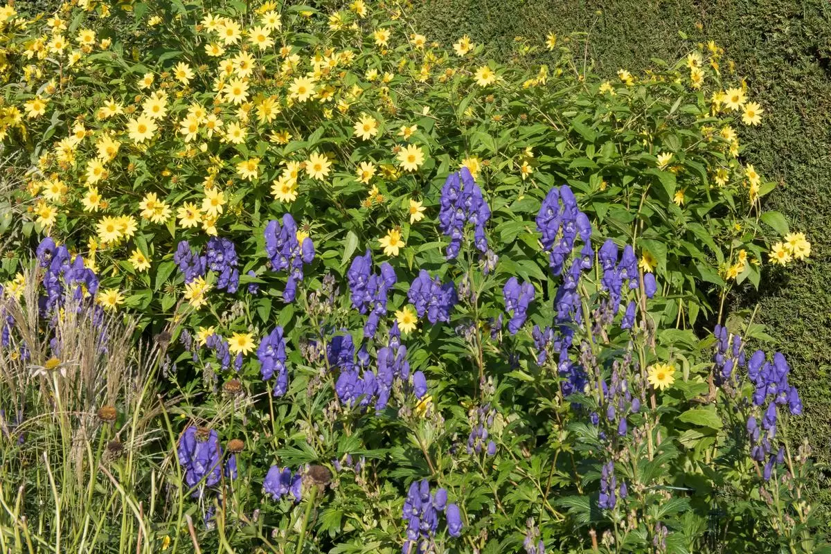 - Аконит Кармайкла — впечатляющее растение с фиолетовыми соцветиями, высота которого достигает 180 см. Он добавит динамики в ваш сад.