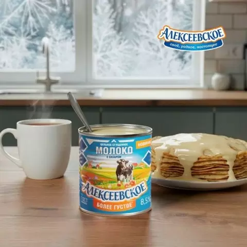 - Шаг 3. Финальный штрих: Не забудьте о густом сгущенном молоке «Алексеевское». Его сливочный вкус придаст вашему блюду тот самый завершающий штрих, который сделает блины по-настоящему особенными.