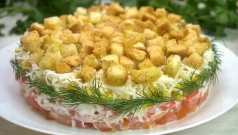 Собирайте салат по следующему принципу: на дно кладите помидоры, затем крабовые палочки, следом кукурузу, а затем натертый плавленый сыр. Завершает композицию хрустящие сухарики, которые добавляют блюду особый шарм. Убрав кольцо, салат стоит украсить зеленью укропа, что добавит ему эстетического завершения.