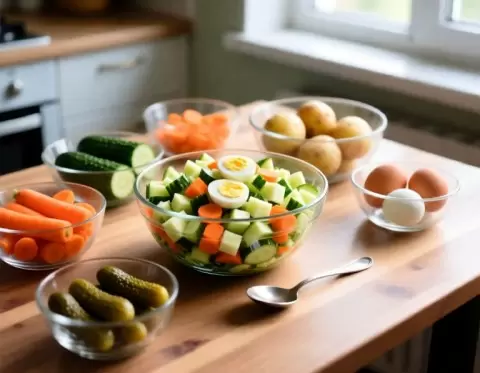 - Классический с колбасой: 300 г докторской колбасы, 3–4 картофелины, 1–2 моркови, 4 яйца, 3 соленых огурца, 1 банка горошка.