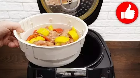 После этого поместите получившуюся смесь в корзину пароварки вашей мультиварки. На дно чаши налейте 400 мл холодной воды и установите сверху корзину с курицей и перцем. Выберите режим «Пар/Варка на пару» и установите таймер на 35 минут.