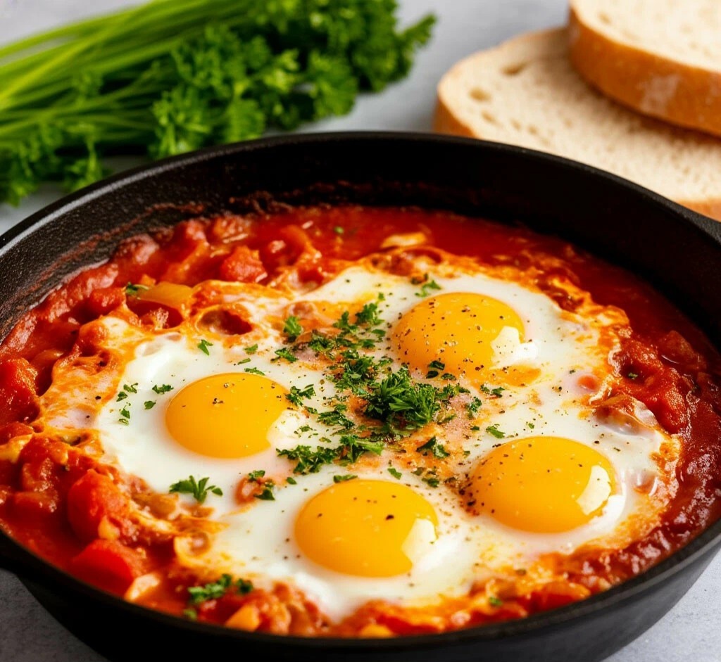 - Сочная текстура: Томатная основа дарит богатый вкус, а желток, смешиваясь с соусом, создает кремовую консистенцию.