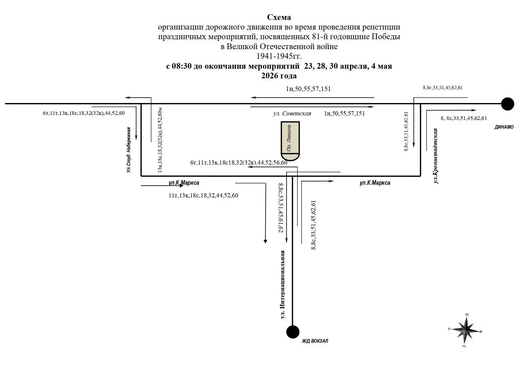 - маршруты №1н, 50, 55, 57, 151 будут следовать по улице Советской;