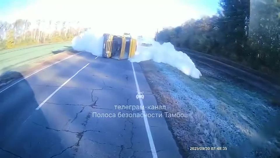 Авария произошла 30 сентября на автодороге недалеко от села Инжавино. Водитель большегруза "не вложился" в поворот и врезался в "Тойоту". - Никто не пострадал. Груз утрачен. Водитель "Тойоты" родился в рубашке. Да и "регистратору" повезло. Секунда, и...