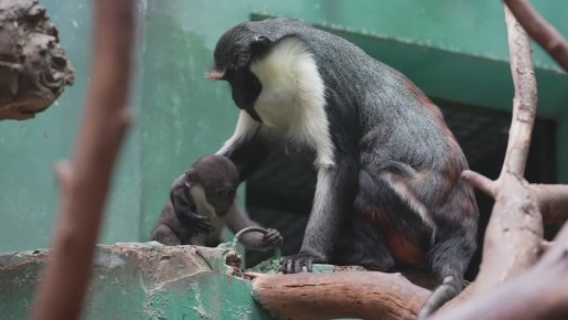 Малыш появился на свет 1 сентября и первые дни мама Фиона постоянно носила его на себе. Пол новорожденного пока не известен. Первые недели детеныш мартышки дианы питался только материнским молоком, но сейчас уже начинает постепенно пробовать...